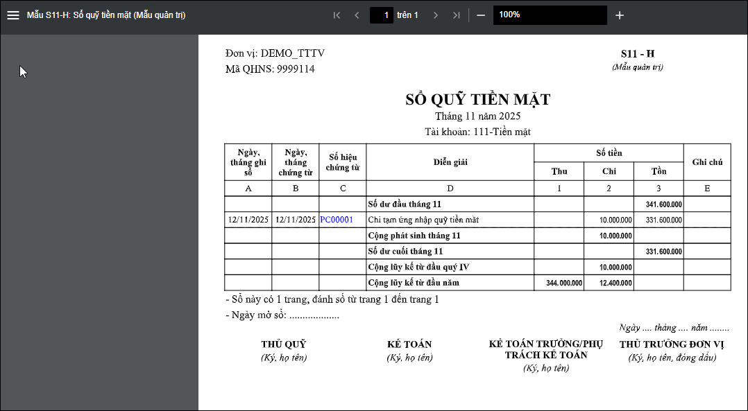 3.1. In Sổ kế toán chi tiết tiền mặt/Sổ quỹ tiền mặt