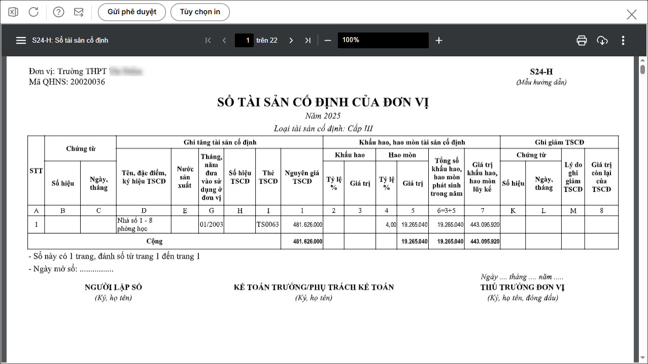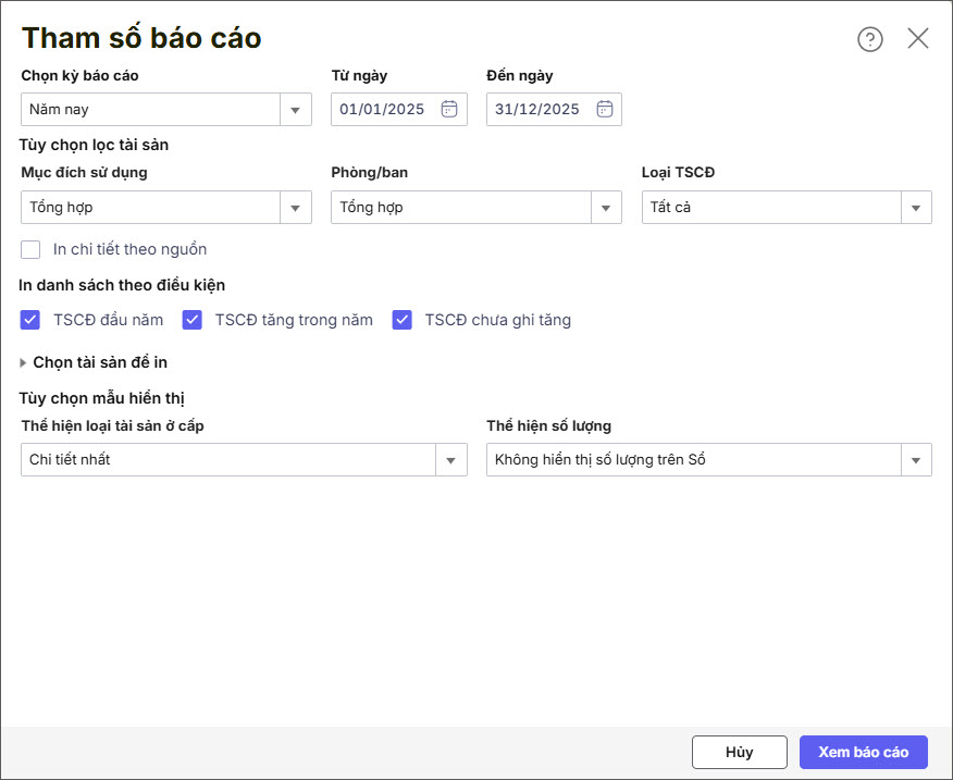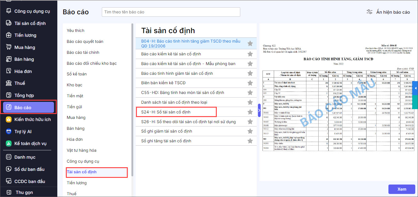 Bước 1: Vào Báo cáo\Tài sản cố định\S24-H: Sổ tài sản cố định.