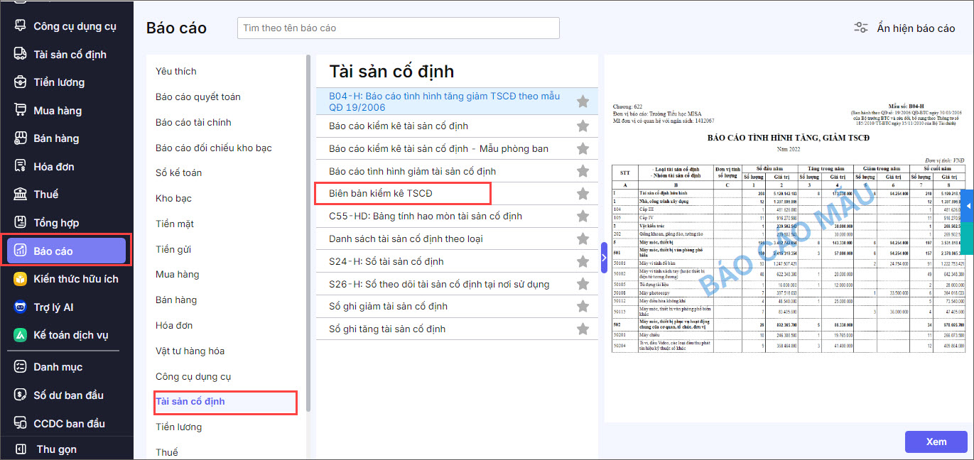 Bước 1: Vào menu Báo cáo\Tài sản cố định\Biên bản kiểm kê TSCĐ.