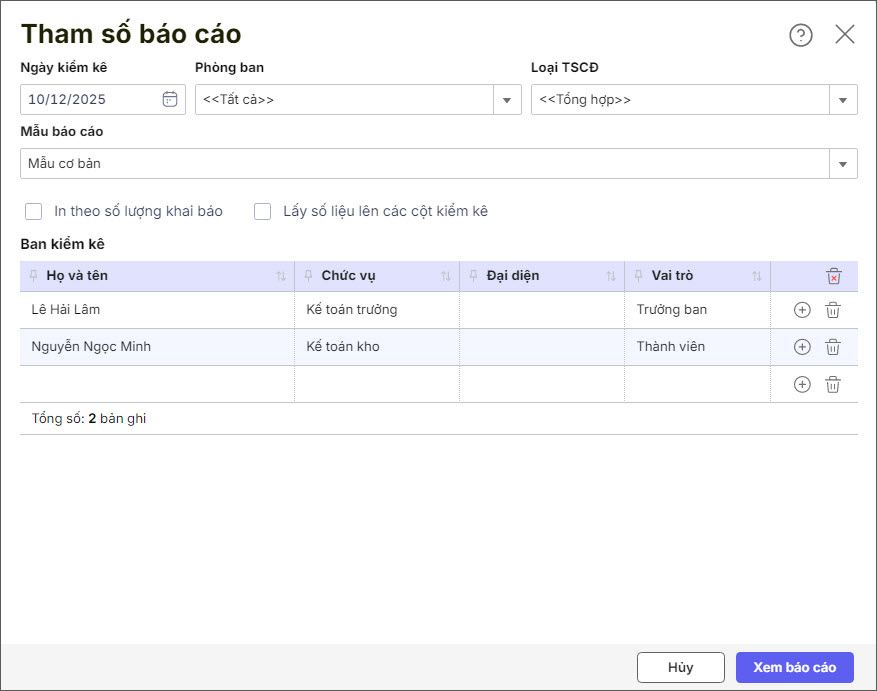 Bước 2: Khai báo các tham số báo cáo (phải trùng khớp với các tham số khi in Biên bản kiểm kê).