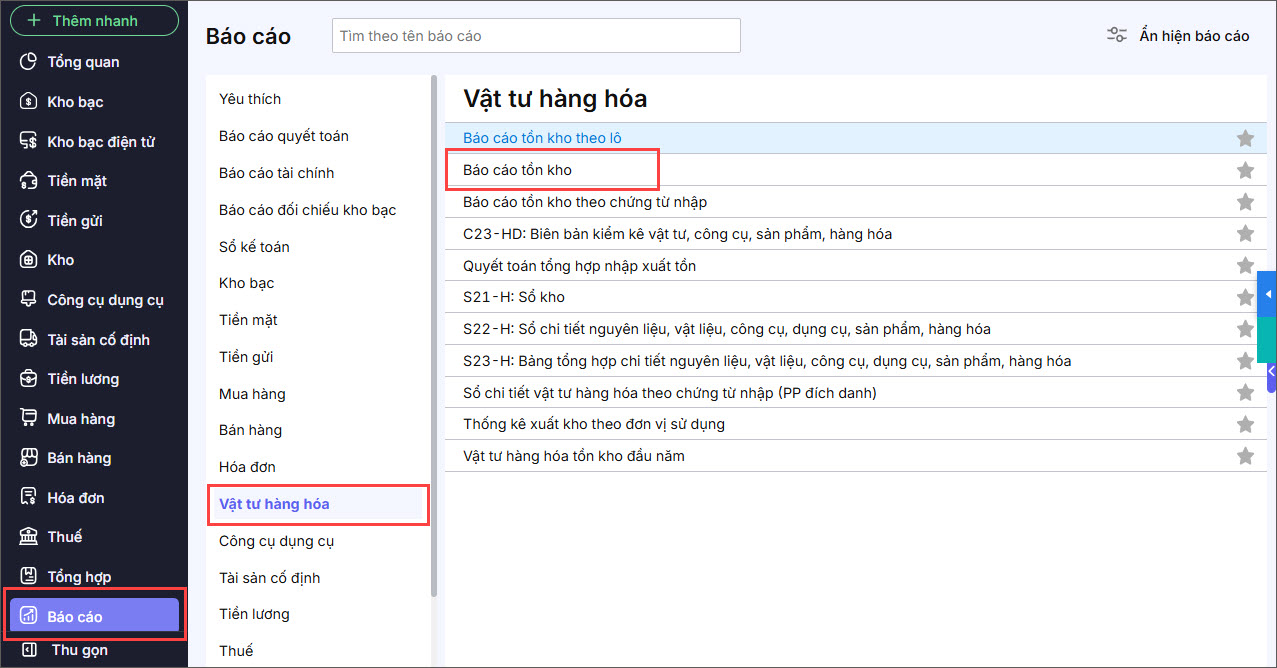 Bước 1: Vào Báo cáo\Vật tư hàng hoá\Báo cáo tồn kho.