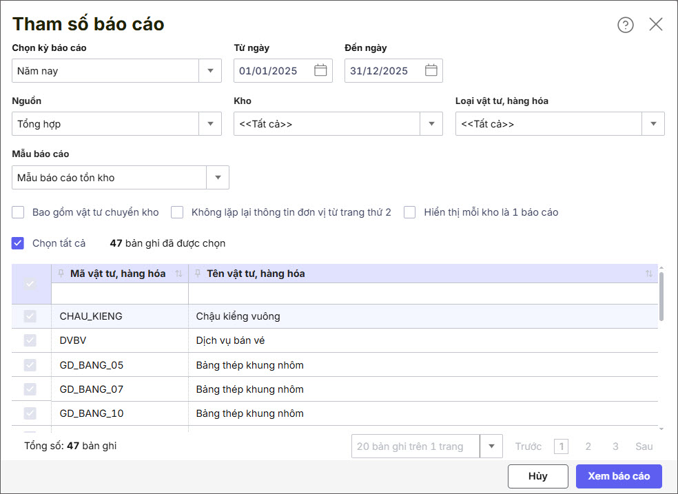 - Chọn mã vật tư hàng hóa cần kiểm tra hoặc tích chọn tất cả