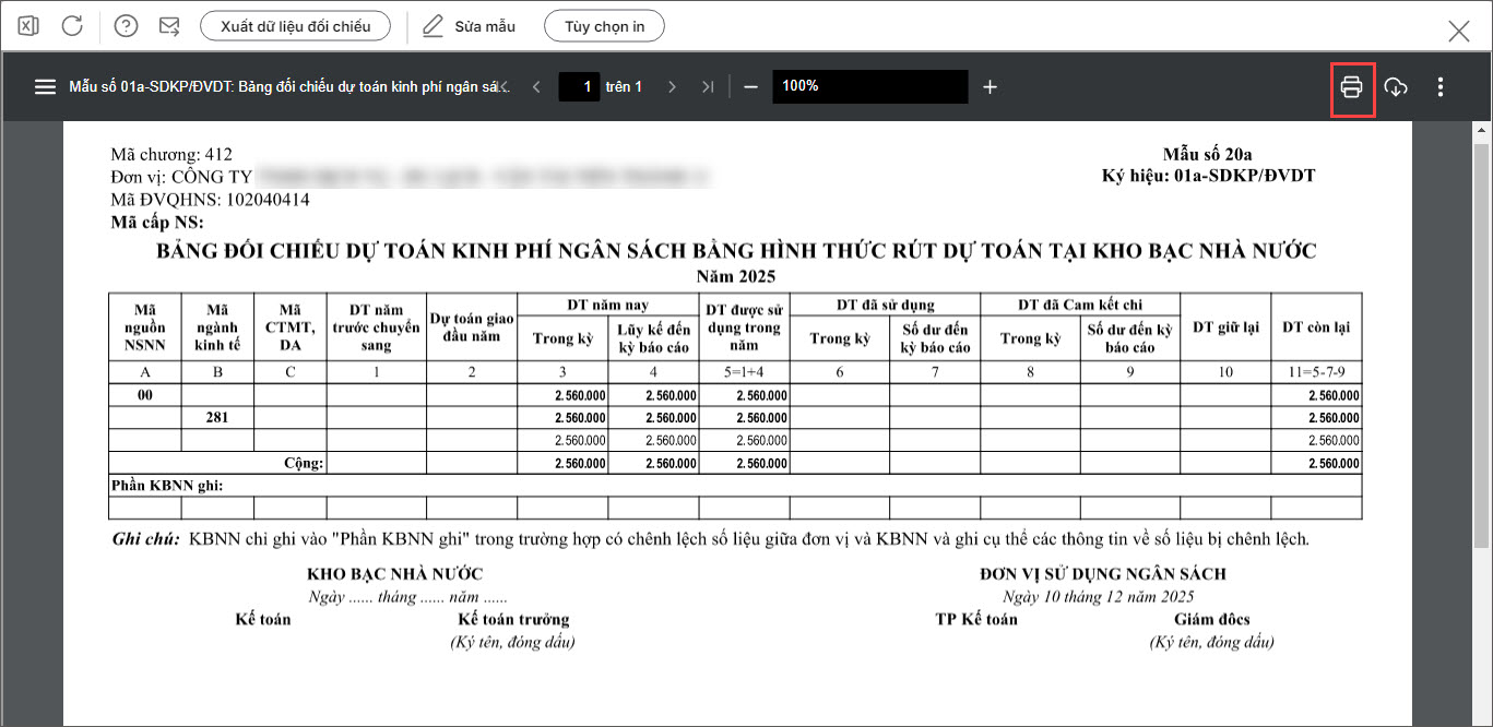 Ví dụ: In Mẫu số 01a: Bảng đối chiếu dự toán kinh phí ngân sách bằng hình thức rút dự toán tại Kho bạc nhà nước.