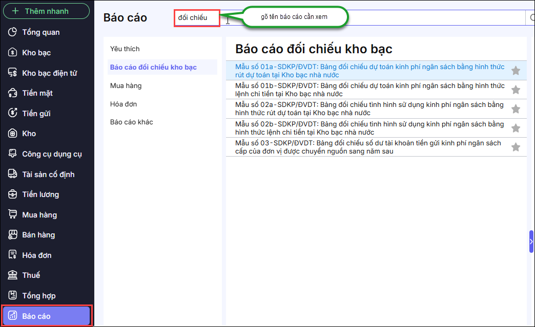 Bước 1: Chọn menu Báo cáo, chọn báo cáo cần xem, in hoặc nhập tên báo cáo vào ô Tìm theo tên báo cáo để tìm kiếm trong danh dách báo cáo