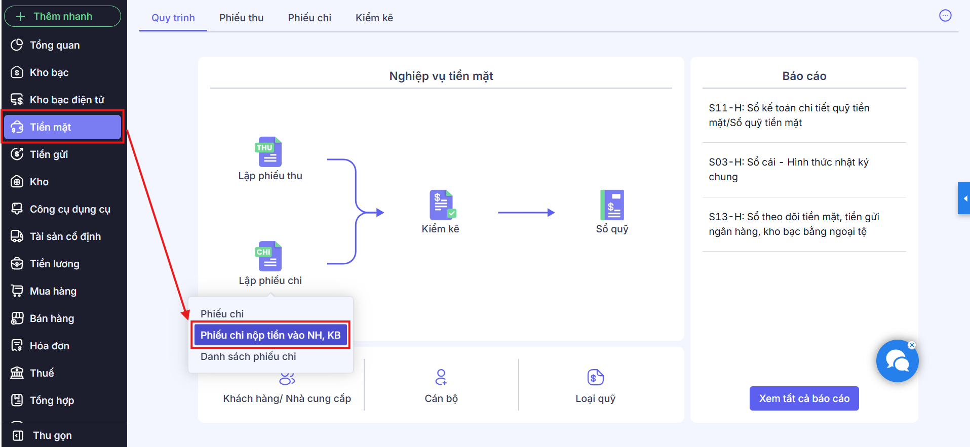 Bước 1: Vào phân hệ Tiền mặt\Phiếu chi nộp tiền vào NH, KB hoặc Tiền gửi\Chi tiền gửi